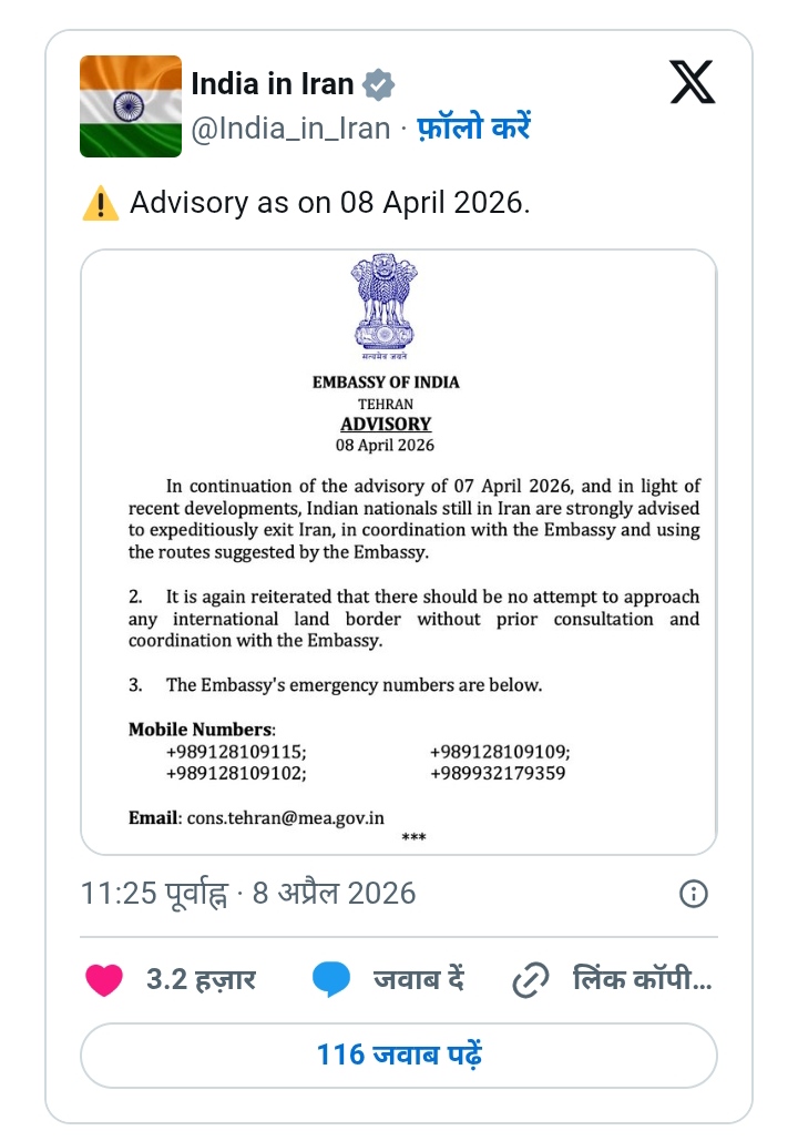 अमेरिका-ईरान के बीच सीजफायर के बावजूद भारत ने जारी की नई एडवाइजरी, नागरिकों से जल्दी ईरान छोड़ने की अपील